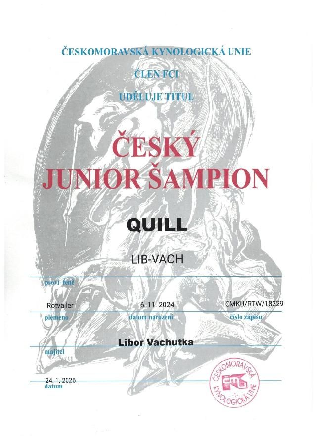 11.10.2012 - DAGIE Lib-Vach získala titul ČESKÝ GRANDŠAMPION a ŠAMPION ČMKU, náš mladý roční pes JACCOMO CASANOVA Lib-Vach získal titul ČESKÝ JUNIOR ŠAMPION.